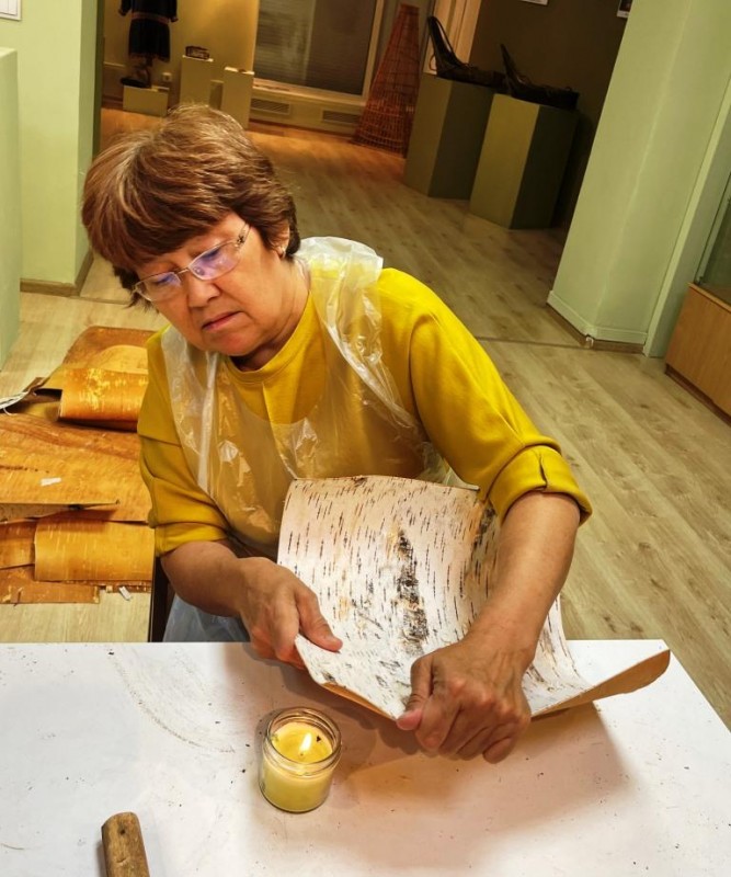 Надежда Постика раньше участвовала в подобном семинаре в музее «Торум Маа», делала маленькую детскую люльку. Теперь пришла сюда, чтобы научиться делать берестяную коробочку.