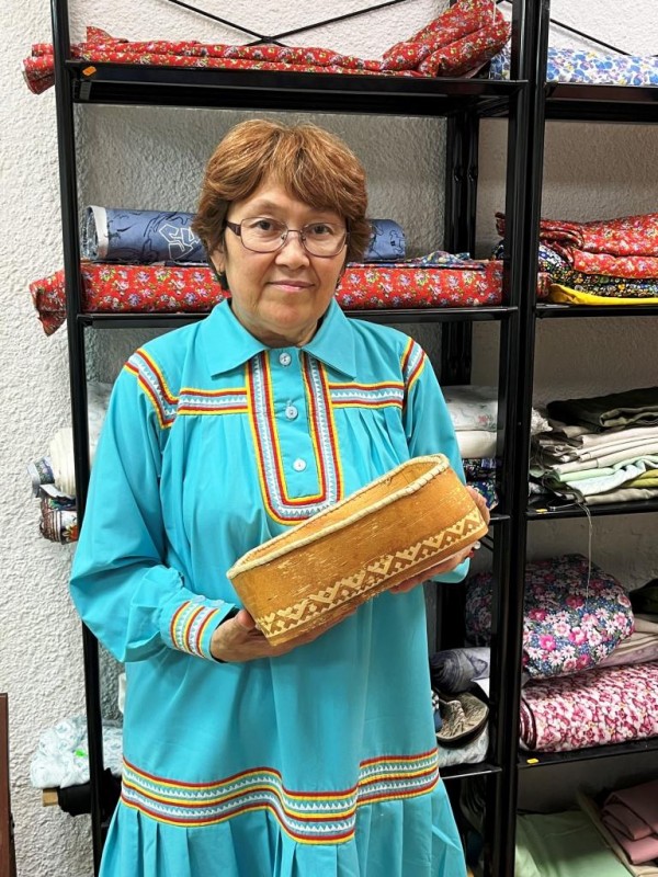 Людмила Волкова из города Югорска 20 лет назад в музее «Торум Маа» уже училась делать берестяные коробочки и наносить на них узоры. Сейчас специально приехала продолжить учёбу – сшила короб из бересты, где наружную и внутреннюю части необходимо сшить вместе. Под руководством мастера она научилась наносить узоры.
