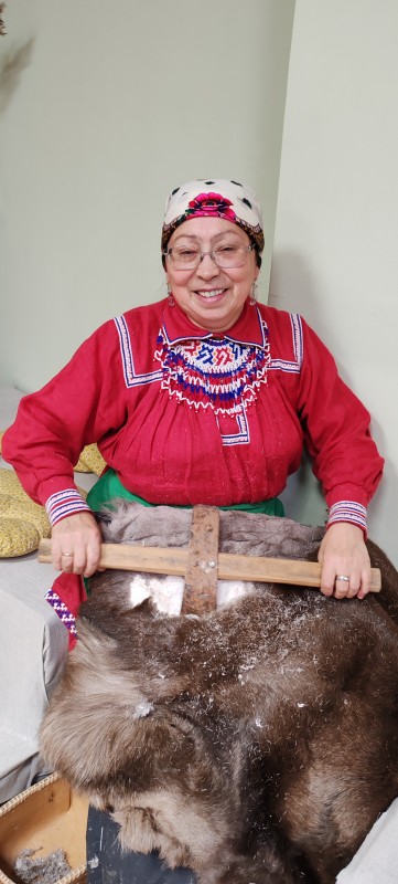 Галина Сергеевна Молданова – представительница казымских ханты, художник-конструктор, мастер, работая в Центре ремёсел, обучает детей плетению хантыйских бисерных украшений. Сегодня все желающие под чутким руководством мастерицы учились кроить и шить хантыйские платья. Кроме этого, Галина Сергеевна показывала мастер-класс по изготовлению из оленьей шкуры ровдуги. Она с удовольствием подробно рассказала и показала весь трудоёмкий процесс. Гости попробовали поработать скобелем и очистить оленью шкуру от волосяного покрова. Из получившейся плотной части шкуры-ровдуги можно было раскроить и сшить традиционную обувь – нюки вей, а из тонких частей шкуры можно было сшить орнаментированные сумочки.