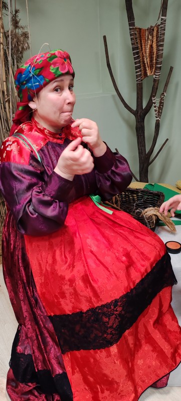 Татьяна Александровна Иванова, сотрудница Центра ремёсел в традиционном коми-зырянском наряде демонстрировала процесс изготовления сухожильных нитей и обучала этому всех желающих.
