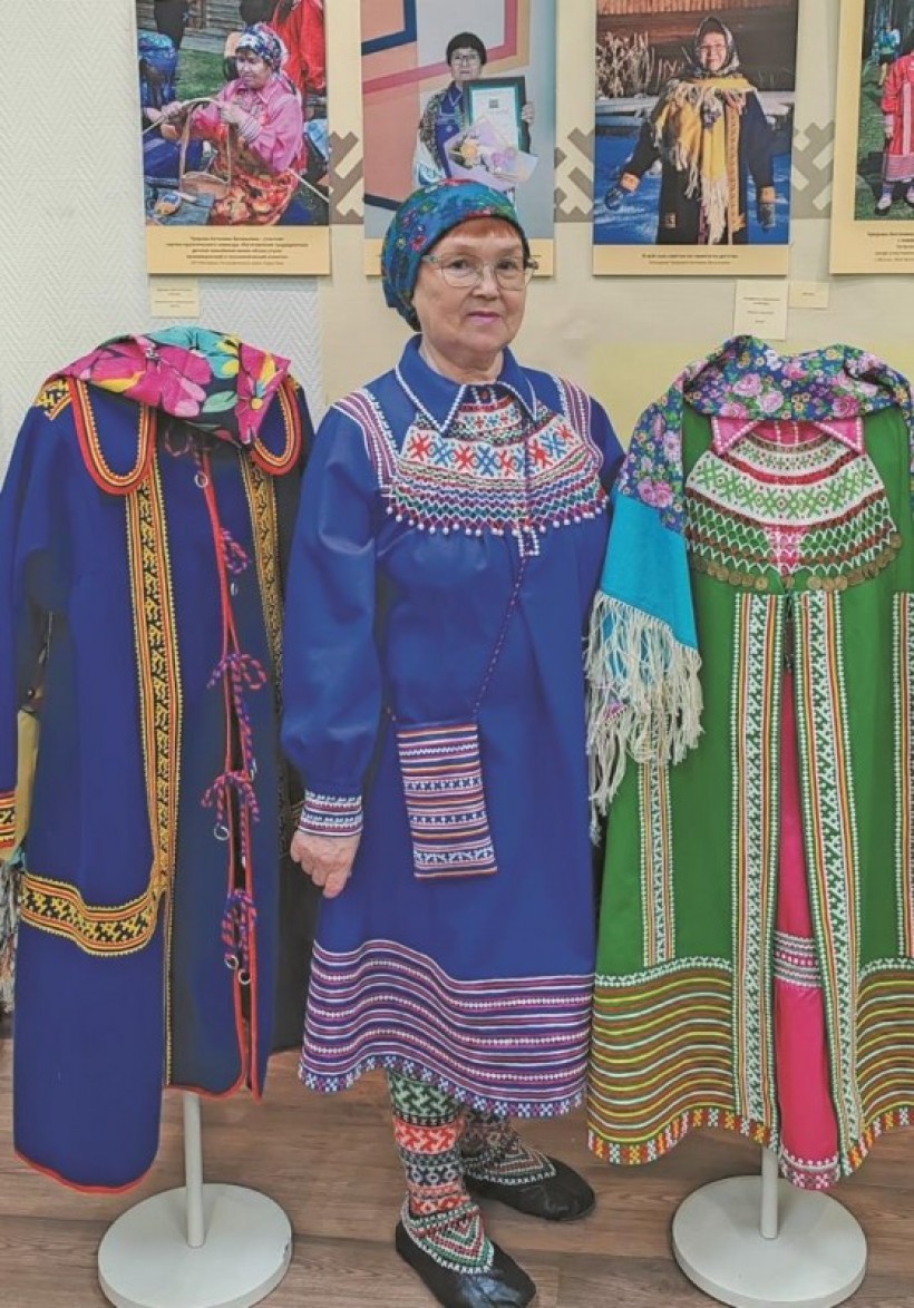 – Мне часто попадаются старинные фотографии, где запечатлены коренные жители в национальных одеждах. Я очень внимательно разглядываю их одежды. На нескольких фотографиях представлены жители из деревни Теги и Старых Пугор середины 1950-х годов XX века. У женщин и ребёнка я заметила необычную орнаментацию. Такой орнаментации сейчас нигде не вижу. Сейчас женское платье и мужская рубаха в верхней части изделий орнаментируется вокруг кокетки, а на этих фотографиях орнамент расположен ещё и по плечевому шву и вокруг горловины. Значит, такая орнаментация имела место быть. Я тоже сшила рубашку с такой же орнаментацией, и она тут на выставке представлена. Ещё я обратила внимание на то, как на старинных фотографиях мастерицы группируют аппликационные полосы по подолу платья. Так, несколько орнаментированных полос подряд с малым интервалом между собой чередуют, а через большой интервал опять пропускают группу с малым интервалом и так повторяется 3-4 раза. Это необычно и интересно.