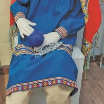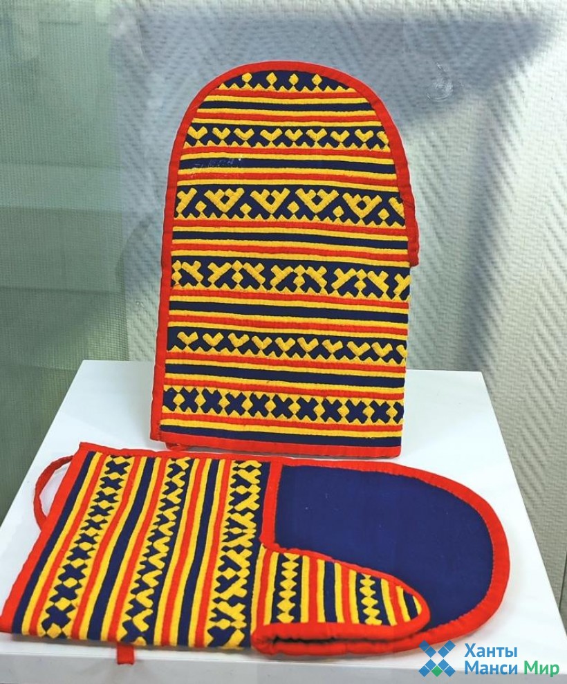 – Да, платья только моего размера. На выставке представлены несколько моих вязанных изделий. Это длинные орнаментированные чулки, где гофрированная часть связана из однотонной пряжи. У нас в Тегах не носили такие чулки, но я всё же связала. Тут же короткие вязанные чулки с орнаментом, вот такие у нас носили. Детские орнаментированные рукавички, которые я связала на одном из учебных семинаров. Когда участвовала в научно-практическом семинаре в музее «Торум Маа», то сшила женские орнаментированные рукавицы из ткани. В процессе шитья вспомнила себя в детстве у бабушки, как я стою у хлебной печи и вижу движения рук моей бабушки вот в таких орнаментированных аппликацией «ткань по ткани» красивых рукавицах, как она доставала хлеб из печи. Бабушку мою звали Анастасия Васильевна Неттина (Шульгина). Она родилась в деревне Мувхот (с/с Азовы) Шурышкарского района.