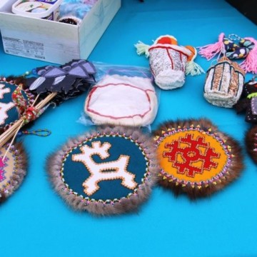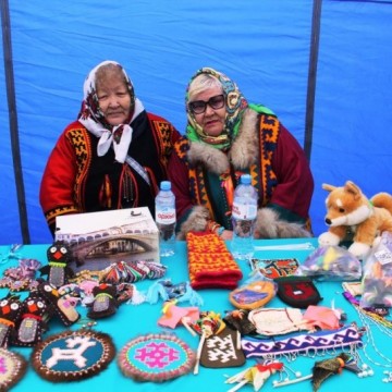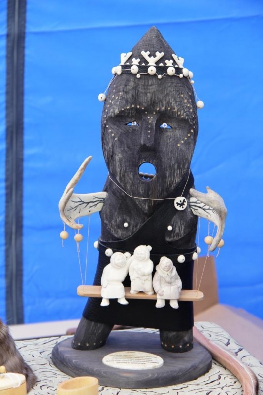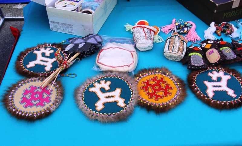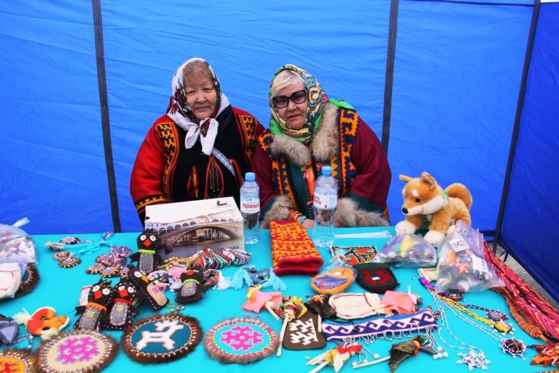 С раннего утра на праздник «Вороний день» приехали предприниматели, мастера, мастерицы традиционных промыслов. Они разложили на столах мороженую оленину, рыбу разных сортов, дикоросы, традиционную обувь, одежду, вещи, национальные сувениры.