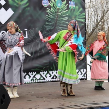 Затем ведущий пригласил на сцену фольклорный коллектив «Сорни най» («Золотая женщина»), приехавший на праздник из села Шурышкары Ямало-Ненецкого автономного округа. Участница коллектива Светлана Кельчина поприветствовала гостей праздника: