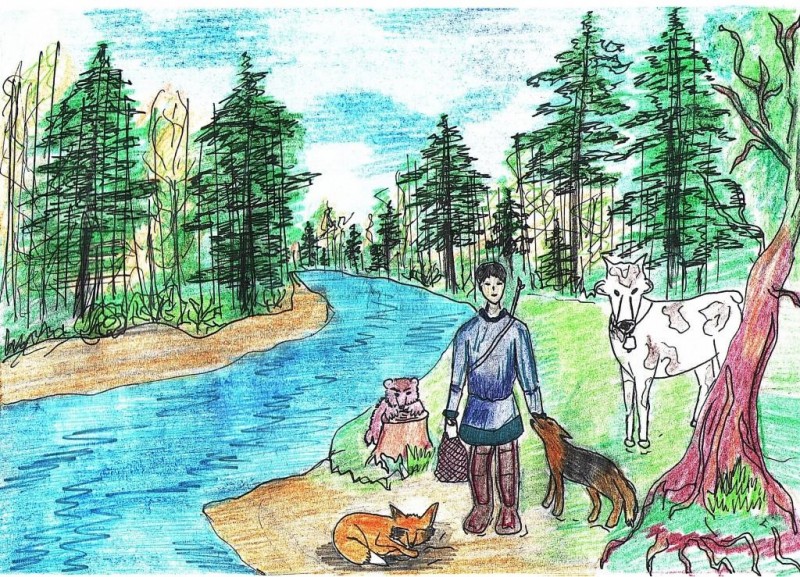 Ночь переночевали и с утра пустились в дорогу. Перебрались на другой берег, нитки свернули и дальше пошли. Долго ли, коротко ли шли, к росомахе пришли. Росомаха на них злится и рычит. Говорит он росомахе: «Ты не сердись! Нас к тебе сестра отправила за молоком. Может, твоего молока попьёт и поправится». Росомаха перестала рычать и дала молока. И ещё детёныша своего отдала. И говорит он: «Если твоя сестра моё молоко не выпьет, отдайте моему детёнышу, он выпьет».