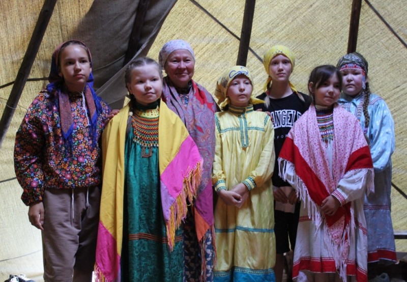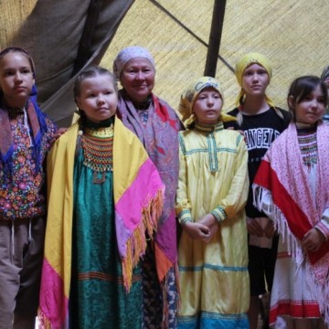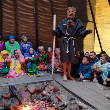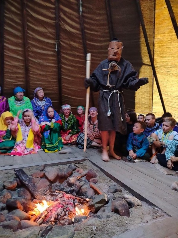 В детском стойбище каждый вечер проходят различные мероприятия. Так один из вечеров был посвящен сценкам из Медвежьих игрищ. В чум, где собрались все жители стойбища, приходили наряженные берестяные маски и разыгрывали сценки из повседневной жизни, высмеивали людские пороки. После завершения каждой сценки мальчики играли мелодии на сангквылтапе. А девочки исполняли мансийские танцы в своих национальных нарядах. Женским танцам девочек обучают Евгения Вьюткина и Карина Ларионова. Стоит отметить, что младшие девочки тоже очень хорошо выучили один из мансийских танцев и хорошо его исполняли.