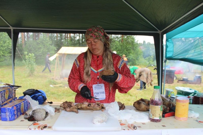 – Сначала я ощипала утку, потом опалила над костром. Но в связи с тем, что у нас мало времени, я её заранее уже подготовила и два часа варила. Потом отделяю грудку и на 30-40 минут помещаю в коптильню, когда она прокоптится, разделаю её на кусочки. Затем раскладываю на кусочки домашнего хлеба и сверху положу клюквинку, получится такое небольшое канапе. Раньше так кондинские манси коптили утку. У нас здесь глинобитные коптильни строили. Её изготавливали из тальника, а затем обмазывали глиной и вот в такой коптильне коптили утку. Но в ней её нужно держать часа три-четыре.
