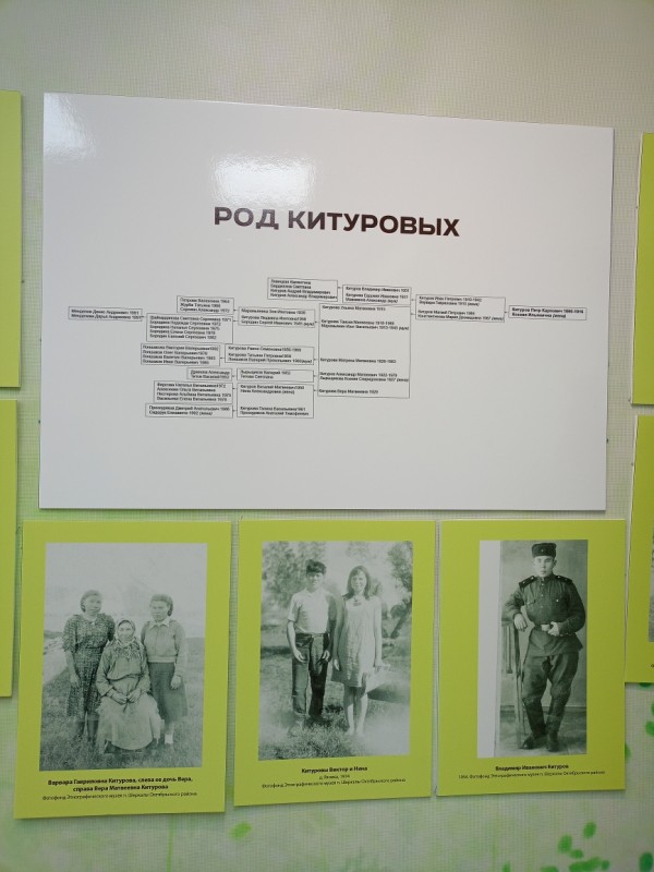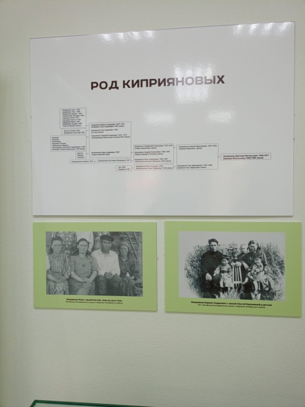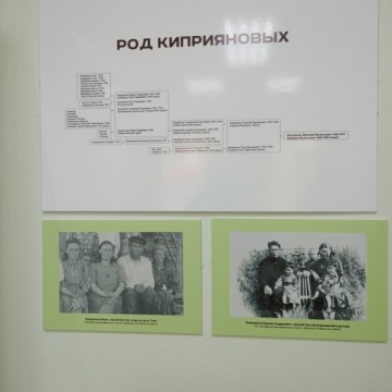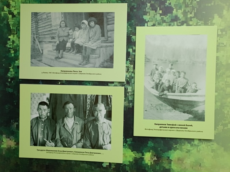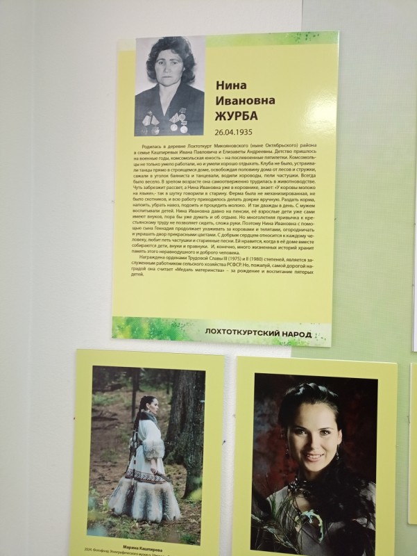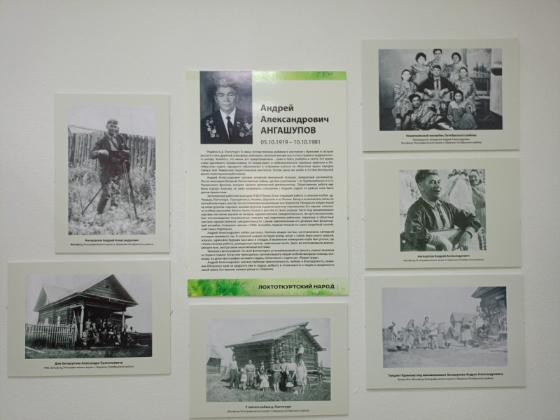 Наталья Владимировна выросла в этой деревне, и поэтому знает биографию каждой хантыйской семьи – это Ангашуповы, Киприяновы, Китуровы, Тебетевы. Сама она из рода Ангашуповых и на выставке представила большое родословное древо. Много лет работая в этнографическом музее села Шеркалы, она собрала ценные материалы. Предметы из коллекции этого музея, фотографии из семейных альбомов, принадлежавшие жителям деревни Лохтоткурт, представителям династий наполнили экспозицию зала.