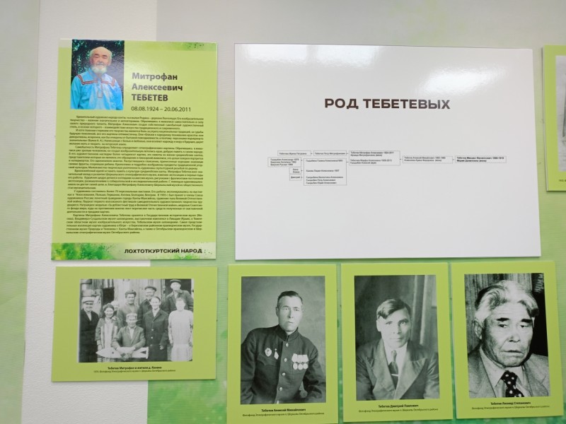 Третья семья, с которой нас знакомили – был род Тебетевых. Имя Митрофана Алексеевича Тебетева широко известно как в автономном округе, так и за его пределами. Он запечатлел память о культуре среднеобских ханты на холстах. Примечательно, что 8 августа, в день открытия выставки, художнику исполнился 101 год. В его роду также были музыканты, Леонид Степанович обладал хорошим голосом, безупречным музыкальным слухом. Помнят и замечательного сказителя Степана Тебетева.