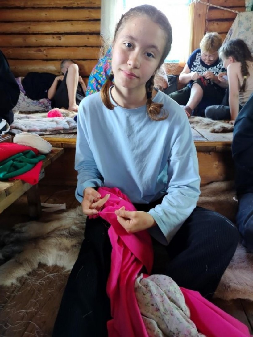 В детском стойбище «Мань Ускве» мы пообщались с Кирой Боднар – девочкой, которая уже третий год приезжает сюда каждое лето. Она учится шить традиционные изделия и говорить на мансийском языке.