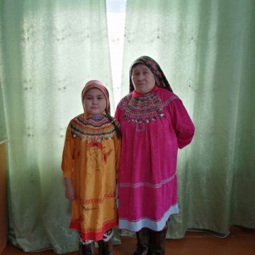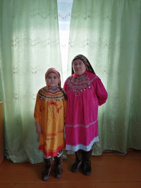 Бабушку по маминой линии звали Анна Никитична Монина. Она шила меховую одежду и обувь, пальто из сукна, мансийские платья. У неё был традиционный мешочек для рукодельных принадлежностей (по манс. тучанг), я всё детство с ним играла. И у мамы есть такой мешочек. Бабушки не стало в 2017 году.