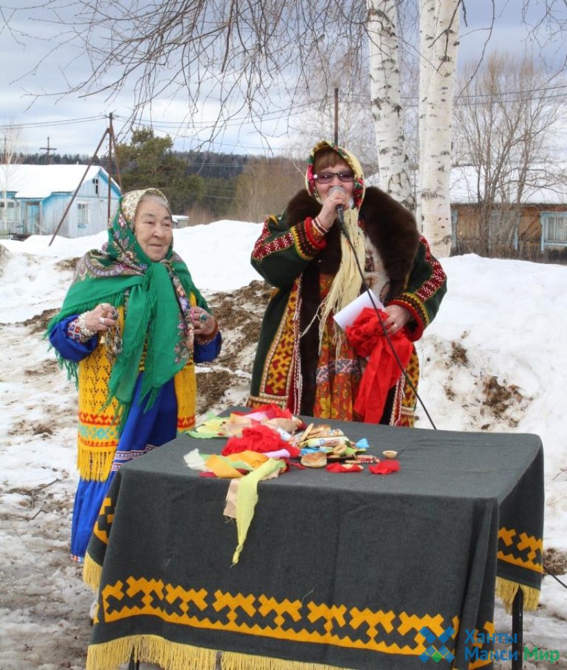 Праздник начался с обряда поклонения Огню и Духам-покровителям назымской земли. Провели его Почётный житель Ханты-Мансийского автономного округа – Югры Мария Кузьминична Волдина и жительница поселка, ветеран оленеводства Антонина Николаевна Никонова. Прочитав молитвы на хантыйском языке, они пригласили жителей повязать кусочки ткани на березу. Этот ритуал завязывания кусочков ткани коренные жители соблюдают всегда при проведении любых сакральных обрядов.
