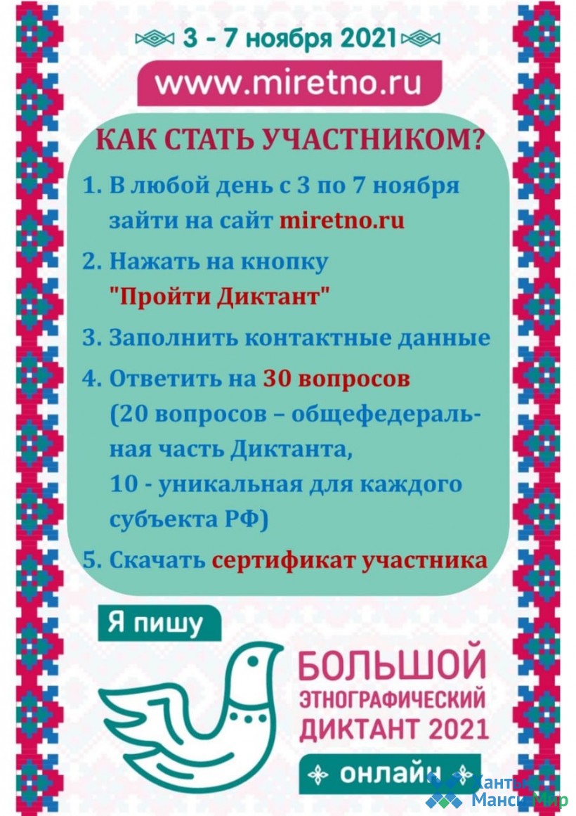 Отметим, куратором диктанта в Югре выступает Музей природы и человека. «Это большая семейная акция, где можно проверить, кто из членов семьи лучше всех знает этнографию. Кроме того, как показывается опыт, диктант стимулирует к изучению народов, населяющих страну, истории нашего региона», - отметила старший научный сотрудник отдела истории и этнографии Музея природы и человека Наталья Тучкова.