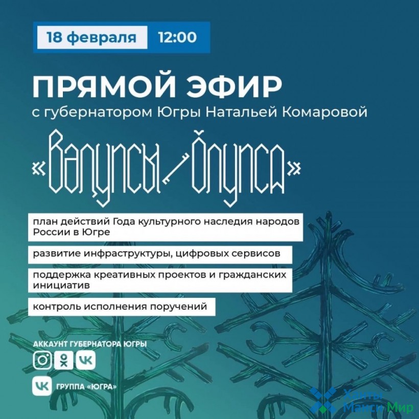 Прямую линию «2022 – Год культурного наследия народов России» проведет губернатор автономного округа Наталья Комарова в своих аккаунтах социальных сетей «Инстаграм», «ВКонтакте», «Одноклассники» в пятницу, 18 февраля, в 12:00.