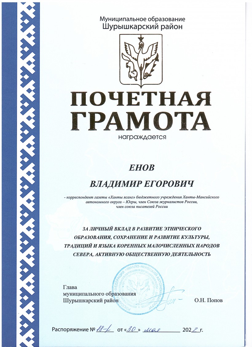 Мы, сотрудники окружной Объединённой редакции национальных газет «Ханты ясанг» и «Луима сэрипос», присоединяемся к их поздравлениям, желаем Владимиру Енову крепкого здоровья, творческих успехов во благо Югры, Ямала и России!