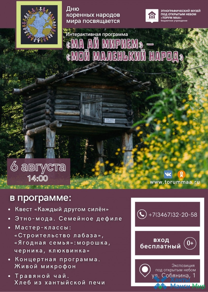 6 августа 2022 года в 14:00 на Экспозиции под открытым небом музея «Торум Маа» в преддверие Международного дня коренных народов мира приглашаем стать участником программы «Ма ай мирием» – «Мой маленький народ», где мы вновь расскажем о культуре северных народов ханты и манси.