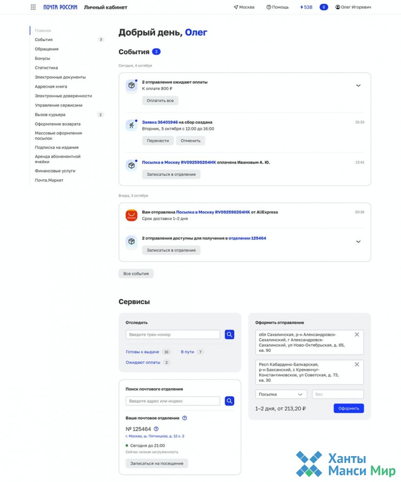 Почта запустила на своем сайте личный кабинет для физических лиц, который устроен по принципу “одного окна”. Теперь оформить посылки и письма онлайн, заказать доставку, а также посмотреть список активных и доступных для подключения услуг можно в едином окне.