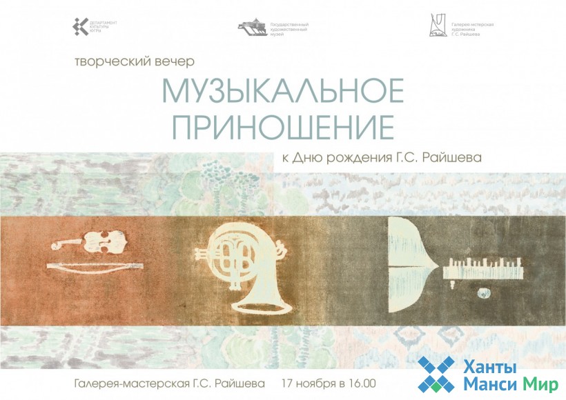 17 ноября в 16.00 в Галерее-мастерской художника Г.С. Райшева, филиале Государственного художественного музея состоится творческий вечер «Музыкальное приношение» к Дню рождения заслуженного художника России Геннадия Степановича Райшева.