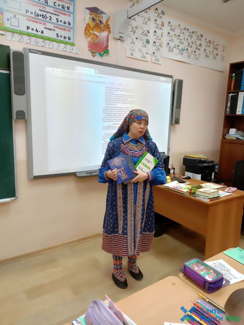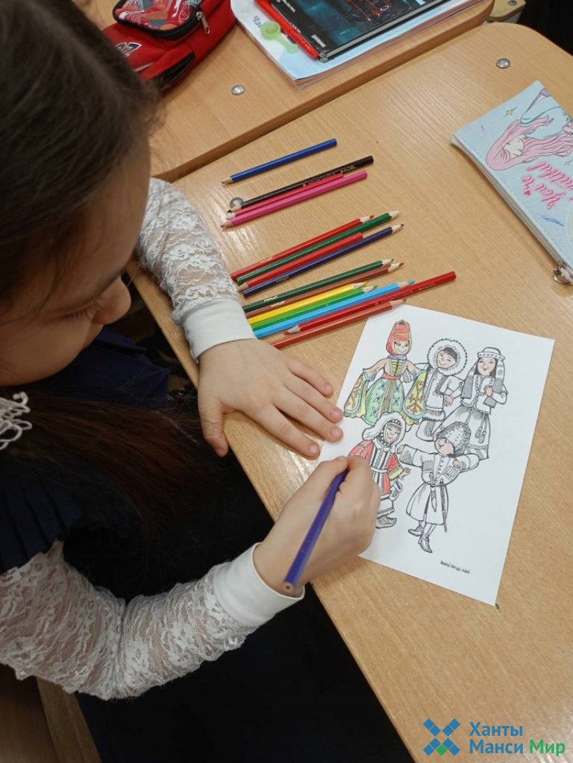 Мы живем в Ханты-Мансийском автономном округе – Югре, поэтому главный акцент был сделан на хантыйский язык. Детям рассказали о том, что существует несколько диалектов хантыйского языка и привели примеры. Им показали традиционные костюмы народа ханты, которые тоже имеют свои отличия. А отличаются они потому, что ханты проживали на разных территориях нашего округа. Школьникам предложили картинки с народами России, которые они с удовольствием раскрасили в яркие цвета. Также ребят познакомили с детским хантыйских журналом «Хатлые», который издаётся в г. Ханты- Мансийске.