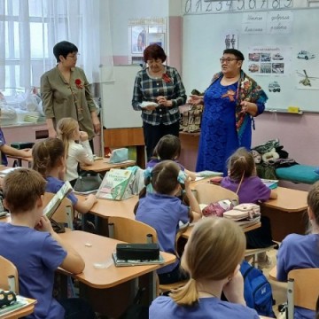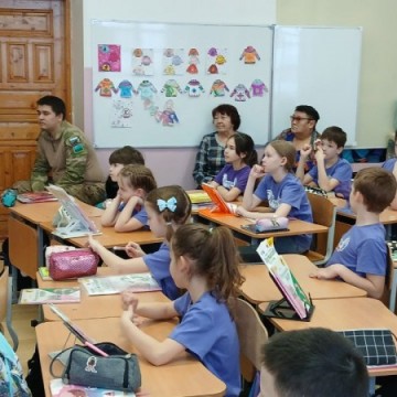Также на встречу со школьниками пришёл участник специальной военной операции Роман Табун. Молодой человек нес службу в составе добровольческого формирования «Барс 10». Он показал ребятам военную амуницию современного солдата. Дал примерять детям бронежилет, показал, как выглядит рация и рассказал, что лежит в аптечке, которая нужна для оказания первой медицинской помощи.