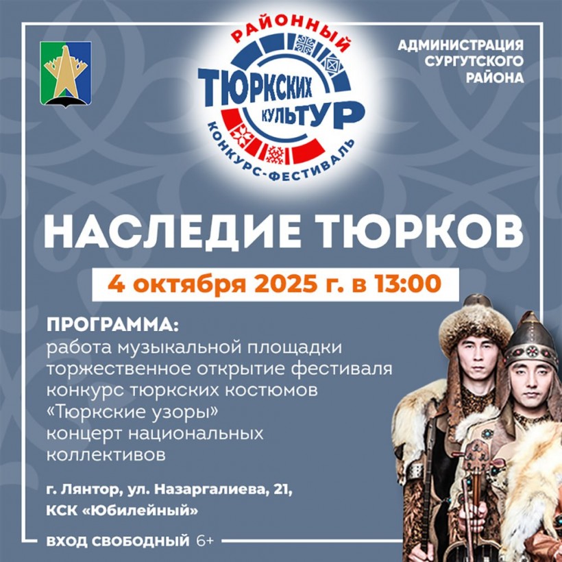 4 октября Сургутский район с нетерпением ждет начала долгожданного конкурса-фестиваля «Наследие тюрков». Это событие станет ярким праздником культуры, объединяющим представителей разных национальностей и подчеркивающим богатство и разнообразие традиций народов, проживающих в нашем регионе.