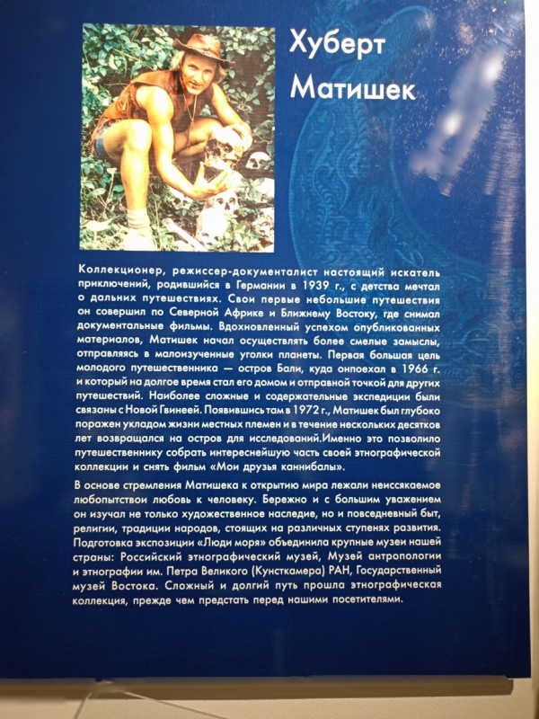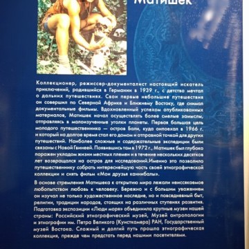 Данная выставка — это лишь малая часть одной из лучших в мире этнографических коллекций, которая собиралась в течение десятилетий немецким путешественником Хубертом Матишеком, а в музее Мирового океана появилась благодаря предпринимателю и меценату Владимиру Ивановичу Щербакову.