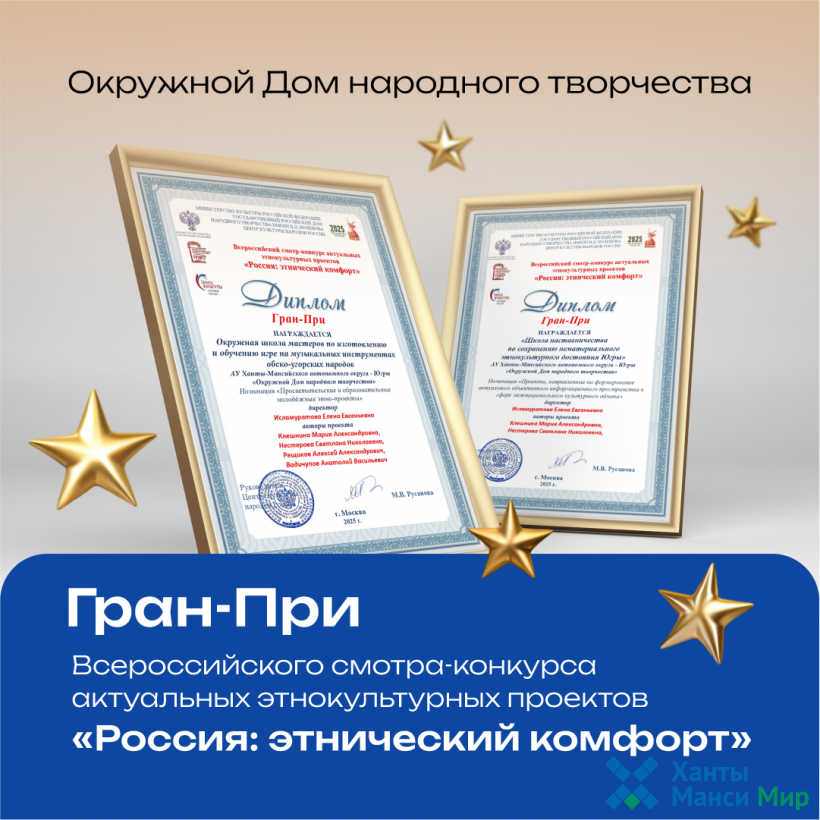 «Окружная школа мастеров по изготовлению и обучению игре на музыкальных инструментах обско-угорских народов» стала обладателем высшей награды в номинации «Просветительские и образовательные молодёжные этно-проекты».