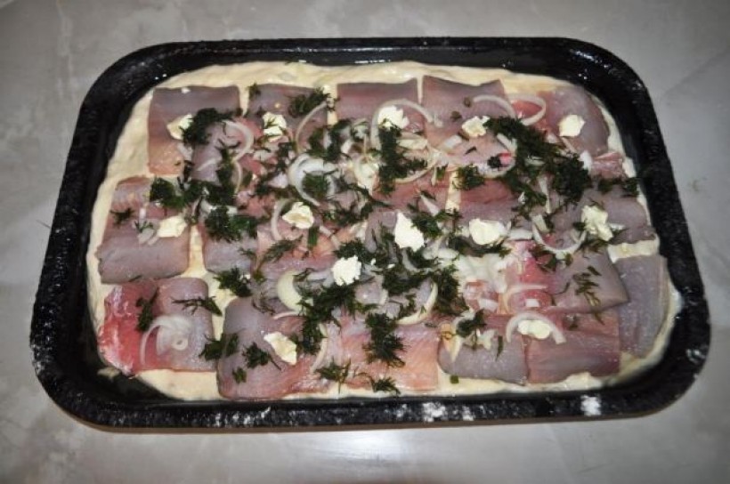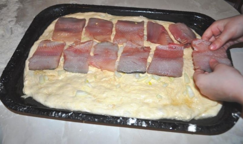 Затем тесто выкладывается на предварительно смазанную сковороду или противень. В центре размещается голова рыбы, по окружности – остальные куски. Всё это сверху посыпается солью и нашинкованным луком, кладётся лавровый лист и накрывается другим слоем теста. В середине верхней крышки пирога оставляется небольшое круглое отверстие, чтобы рыба успела пропечься в печи за 35-40 мин.