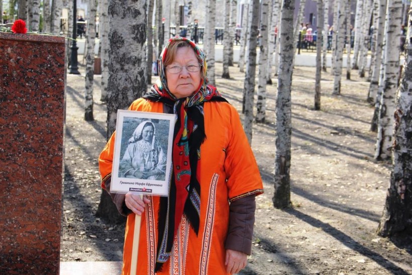 Людмила Зубакина (Гришкина) несла портрет своей мамы. В повествовании о своём самом близком человеке она подчеркнула, что Марфа Ефремовна Гришкина – труженица тыла. В годы военного лихолетья ей приходилось много работать: рыбачить, заготавливать сено и дрова, шить тёплые вещи для бойцов, заниматься сбором ягод для нужд фронта. Тогда повсеместным стал девиз «Всё для фронта, всё для Победы!», и люди трудились добросовестно. Акция «Бессмертный полк» очень своевременна. Особенно она в настоящее время просто необходима нашей молодёжи. Они гордятся своими родными дедушками и бабушками, прадедушками и прабабушками. А всё это значит, что память о защитниках нашей Родины будет жить и дальше.