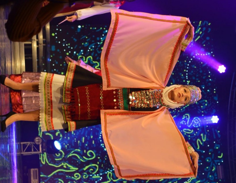 Затем конкурсантки вышли на дефиле в национальных костюмах. Задание усложнило то, что в руках у девушек были обрядовые предметы. Елена представила детскую люльку. На дефиле головных уборов студентка ЮГУ была облачена в национальный платок, налобник из бисера и «турлопс» – нагрудное украшение, сделанное участницей своими руками.