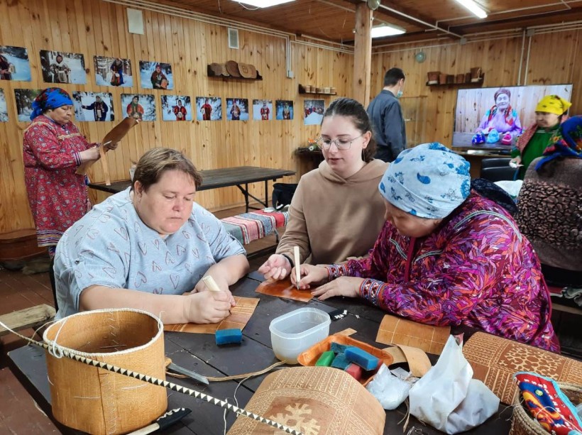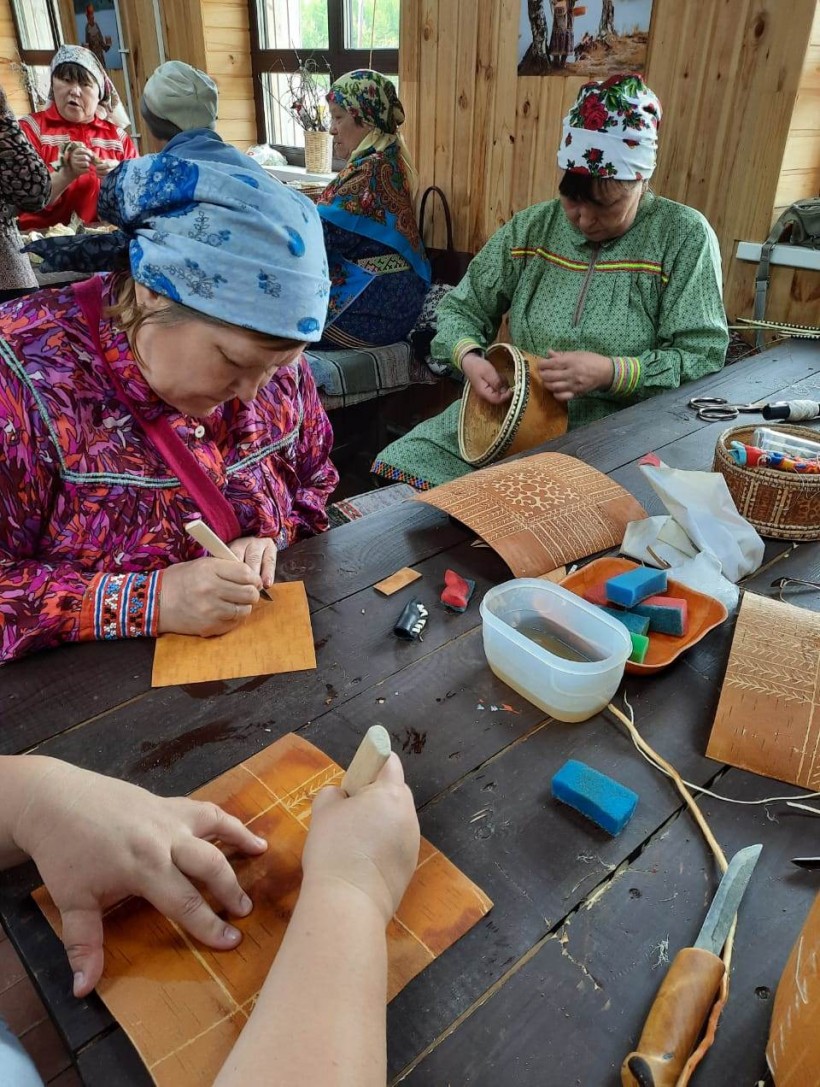 Затем участники фестиваля отправились в здание «Дом у очага», который разместился в зале, здесь гости разделились на две группы. Одна группа работала с берестой, другая – с рыбьей кожей. Наставниками мастер-класса по бересте были А.Г. Ерныхова, М.С. Молданова, З.Н. Тарлина, они обучали тому, как правильно работать с берестой и делать из неё различные предметы быта. Женщины принялись шить берестяные короба, хинт, набирушки (сон). Шили то, что пожелала каждая женщина.