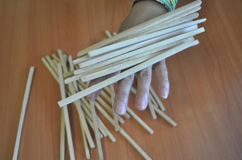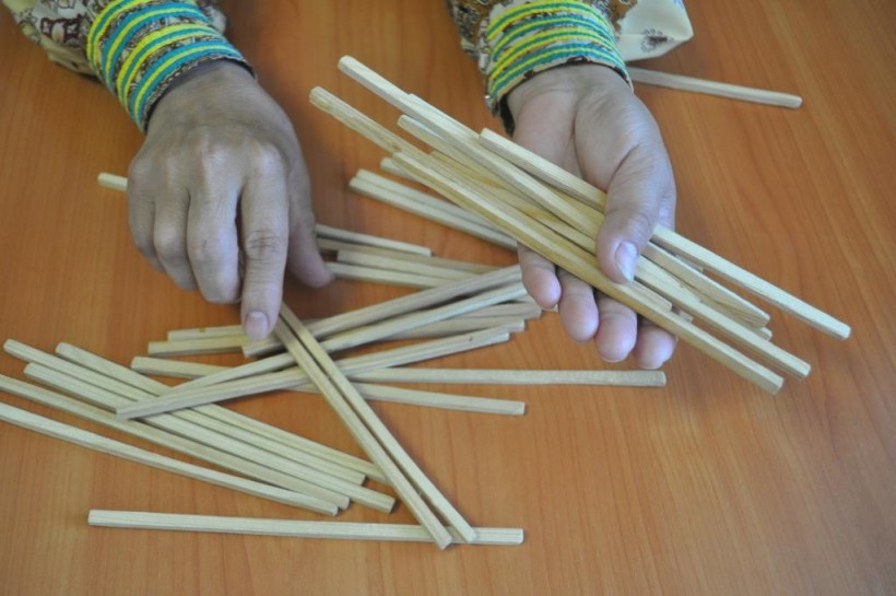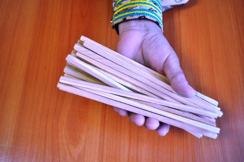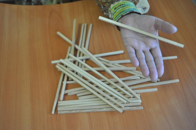 3. Палочки, лежащие на тыльной стороне руки, вновь подкидываются вверх. Необходимо поймать в руку только нечётное количество палочек. Мастера же обычно сразу ловят только одну палочку.