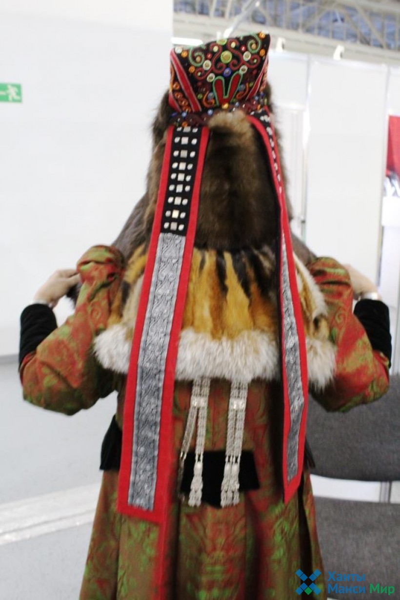 Анисия Иннокентьевна рассказала о некоторых своих изделиях, представленных на выставке. Например, нарядная женская шапка – дьабака. Почему она такая высокая? Чем шапка выше, тем она теснее связана с верхними божествами, ещё повыше бывают, чем эта.