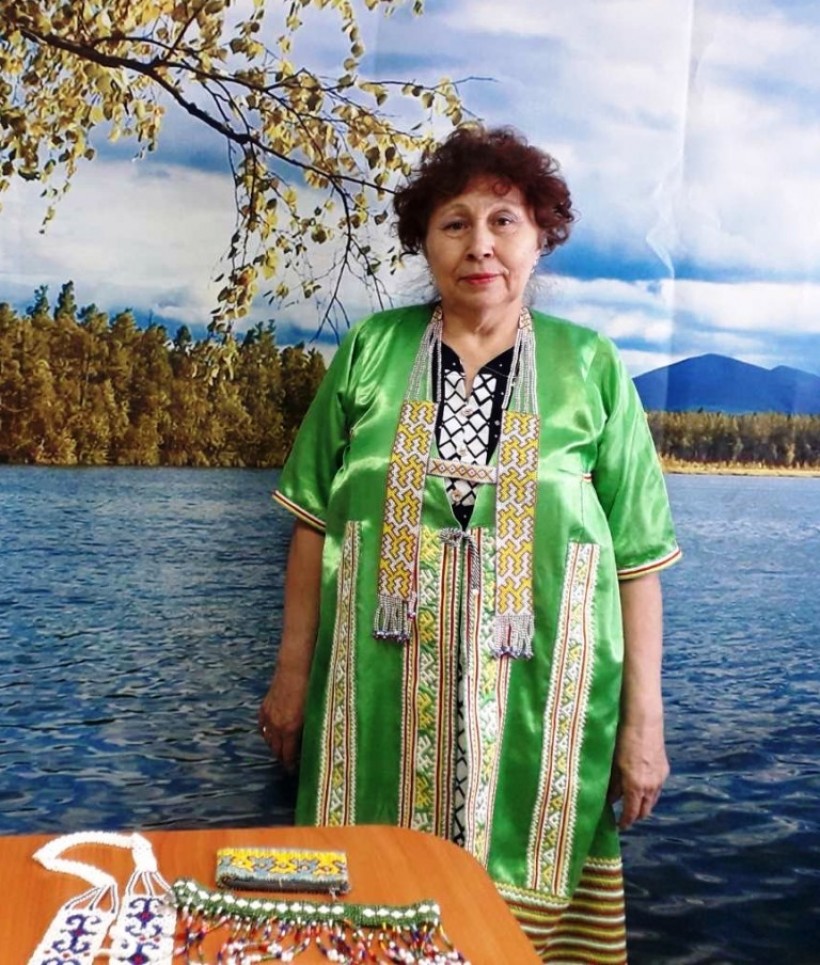 За многолетний добросовестный труд она была награждена почётным званием «Ветеран труда Ханты-Мансийского автономного округа – Югры». Дома без дела сидеть не может, шьёт мансийские платья, плетёт из бисера украшения. Говорит, что этому мастерству научилась ещё в детстве, тогда все девочки шили одежду. Кроме того, вяжет спицами чулки, варежки с узорами, крючком – большие платки. Я увидела на ней красивую, связанную с узорами дамскую сумочку, говорит, что связала специально на зимнее время. Кроме того, её хобби – это выращивание овощей, ягод на своём приусадебном участке.