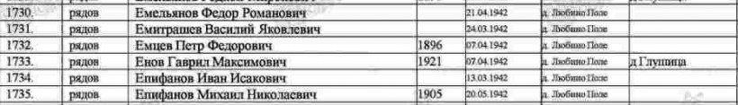 Мєт юхи хӑщум архив нєпекӑтн ӆўв оӆӊӑӆн ма тәп тӑмӑщ айкеӆ ӆўӊӑтсум, муй щирн вән кєр тыӆӑщ 7-мит хӑтӑӆн 1942-мит оӆн ӆўв Любанской наступательной операцияйн ӆаӆясман немщӑтн муй па испанской Голубой дивизия нємуп солдатӑтн пӑратсы. Еша ӛхӑтшӑк Гавриил Максимович Енов Спасская Полисть (па щирн, Глушица нєм тӑйты ай кәртые ӆєпн, вәнт хуща), Чудовской районӑн Ленинградской область мўвн шависы. Щӑӆта щи тӑхи эвӑӆт ӆўв єӆӑӆ муйӆ нух вўсы па Мостки кәртые пўӊӑӆн вєрум мемориал «Любино поле» Чудовской районӑн Новгородской область мўвн шависы па нємӑӆ нух хӑншсы.