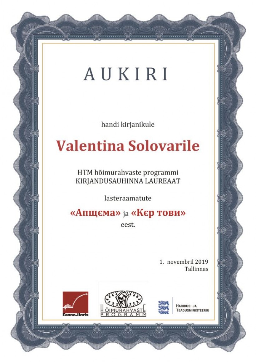 Хантыйской писательнице Валентине Соловар за книги «Апщєма» (2016) и «Кєр тови» (2017). Короткие веселые стихи автора на казымском диалекте имеют четкую форму и адресованы детям дошкольного и младшего школьного возраста. Они учат детей хантыйскому языку и в то же время знакомят их с традиционным образом жизни ханты.