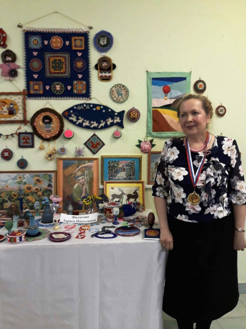 Лариса Николаевна Филатова в этом году отметила 60-летний юбилей, с чем мы её сердечно поздравляем! До самой пенсии она работала лаборанткой в Кондинской больнице, но в связи с болезнью мамы ей необходимо было прервать свою трудовую деятельность и переехать в Полноват. Вот уже больше 10 лет она ухаживает за больной мамой. Но не место красит человека, а человек место. Здесь она быстро вливается в творческую среду местных рукодельниц. Представляет на суд зрителей свои изделия вышивки. А их у неё великое множество, и все они отличаются разной техникой вышивки, аккуратностью и колоритным цветовым оформлением. Всегда в творческом поиске. Ей всё интересно. Сейчас уже плетёт, шьёт традиционные хантыйские изделия. Учит на кружке своих единомышленников изготовлению разных весёлых зверушек! Ей присуждена номинация «Творческий полёт».