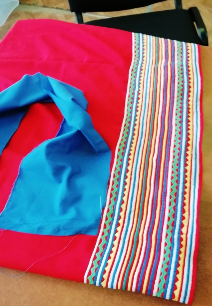 В начале кроят среднюю часть платья – «кутлуп ернас» («середина платья»), затем кроят «ил тахи» («нижняя часть»), т.е. подол платья высотой 20-25см., по-хантыйски называется «порма», «польтяры», в зависимости от локальных особенностей территории. Для точности верхней части платья мерили плечи – «порх». Высоту верхней части кроили до груди, где спереди делали разрез «тур-ов» для ворота. После покроя верхней части кроили рукава «лыт», сразу же вырезают четырехугольные вставки «хонган паты» для подмышки платья. А в конце уже кроили манжеты на рукава «лытов». Затем отмечаем, где у нас будет похлвус «отверстие для пуговицы» и отложной воротник для ворота «тур ов сух». И уже на готовое платье пришиваем «саканг ил тахи» («бисерный подол»).
