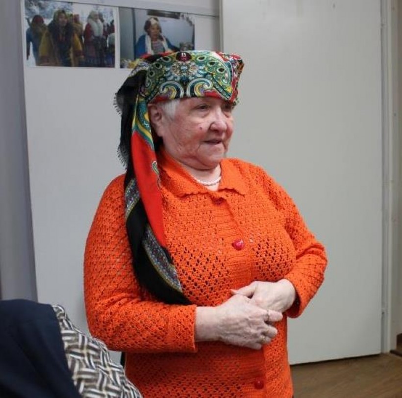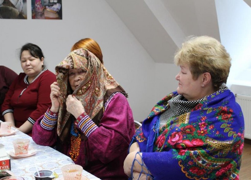 В ходе общения обсудили такие вопросы, как практика использования традиционного обско-угорского и русских платков; платок как атрибут культовых предметов; платок как ритуальный предмет на Медвежьих игрищах; платок как подарок; платок в фольклоре и, наконец, названия платков. Совместными усилиями лектора и присутствовавших на посиделках женщин составили следующий список названий: ай ухшам (маленький домашний платок), вон ухшам (большой платок с кистями), сыланг ухшам (платок с пришитой каймой), русанг ухшам (платок с кистями), пушанг ухшам (двойной платок), паркан ухшам (шерстяной платок с блестящими нитями), ермак ухшам (шелковый платок), русылы ухшам (платок без кистей), песы ухшам (траурный платок).