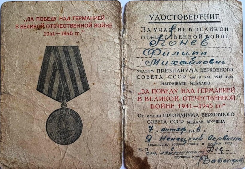 4 июня 1943 года Филипп Ямало-Ненецким военкоматом города Салехарда был призван на фронт. Во время войны он несколько раз был тяжело ранен, лечился в госпиталях. 5 мая 1944 года был демобилизован по ранению и отправлен домой. В архиве семьи Коневых до сих пор хранится удостоверение на медаль отца «За победу над Германией в Великой Отечественной войне 1941 – 1945 гг.», а вот самой медали нет. Как так получилось, никто объяснить не может. Филипп Михайлович сам при жизни делал запрос на медаль, теперь этим продолжают заниматься его дети. Пожелаем же им удачи в этом деле.