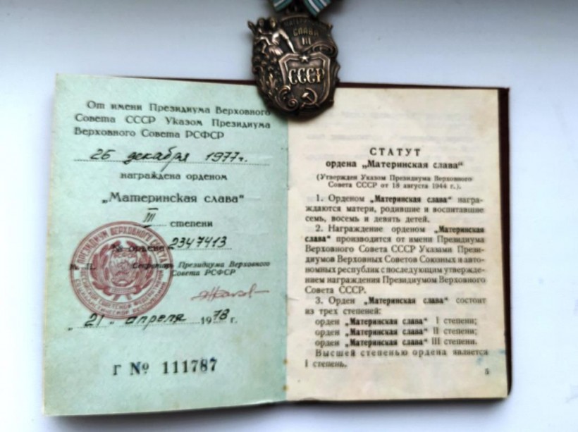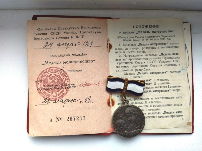 Наша мама – Татьяна Николаевна Енова (Шульгина) от имени Президиума Верховного Совета СССР, Указом Президиума Верховного Совета РСФСР за материнский труд награждена «Медалью материнства» I степени, «Медалью материнства» II степени, орденом «Материнская слава» III степени, памятной медалью «Дети войны». За свой добросовестный труд в рыбной отрасли имела почётные звания: Ветеран труда Ямало-Ненецкого автономного округа и Ветеран труда Российской Федерации.