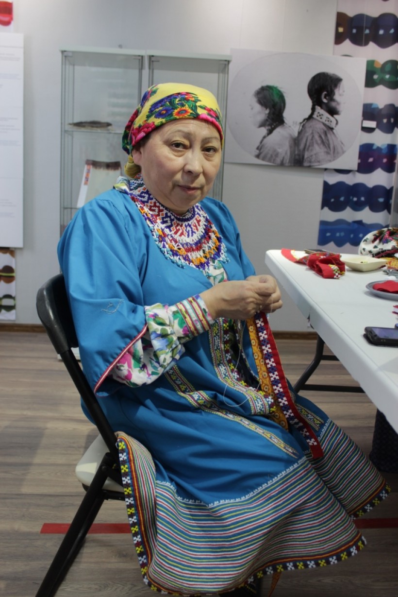 Хантыйская мастерица Галина Сергеевна Молданова работает педагогом дополнительного образования в детском этнокультурно-образовательном центре «Лылынг союм» в Ханты-Мансийске. В музее «Торум Маа» на семинаре «Традиционные бисерные изделия и бытовая деревянная утварь обских угров» она была мастером по изготовлению бисерного подола для платьев.