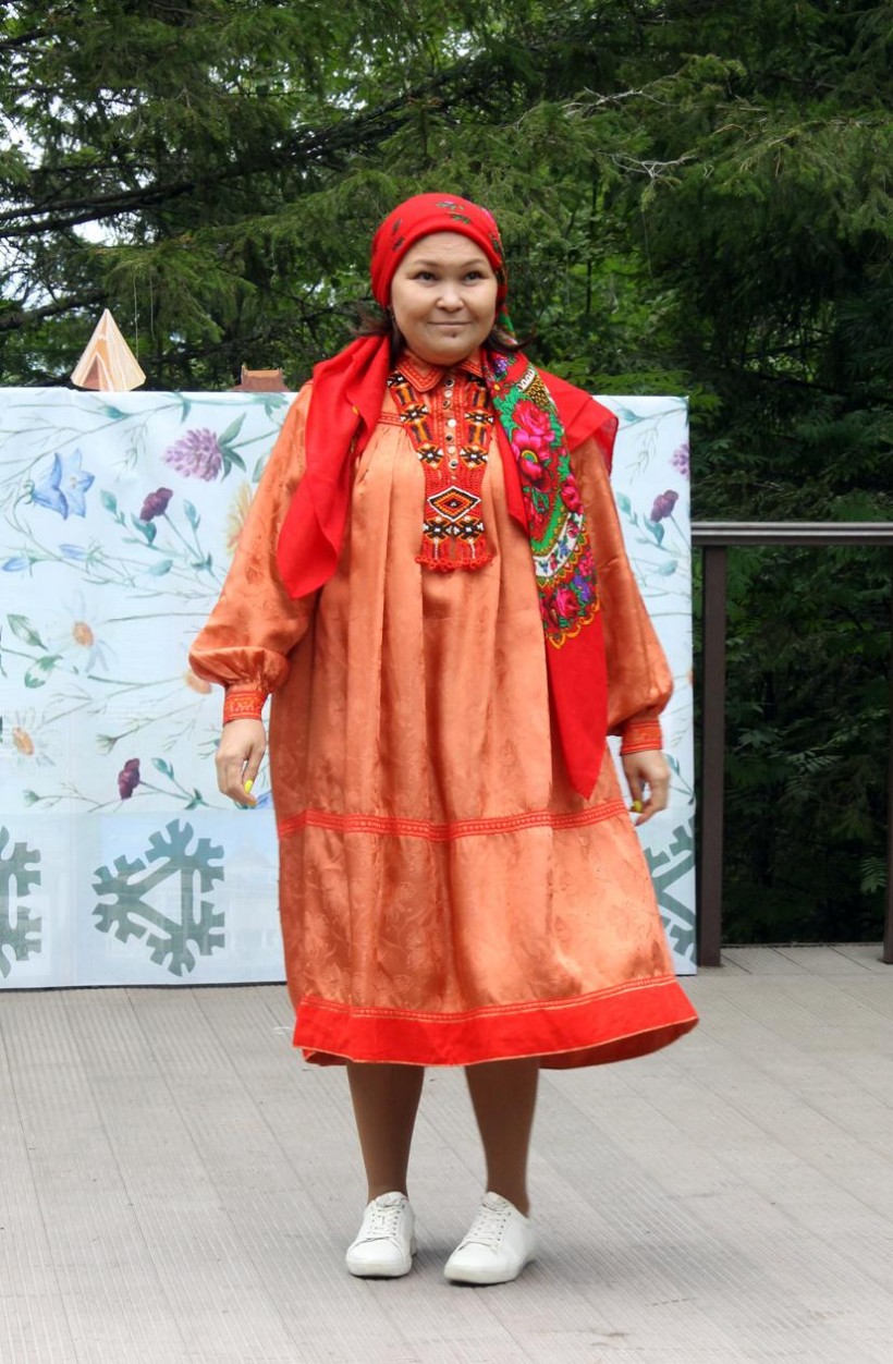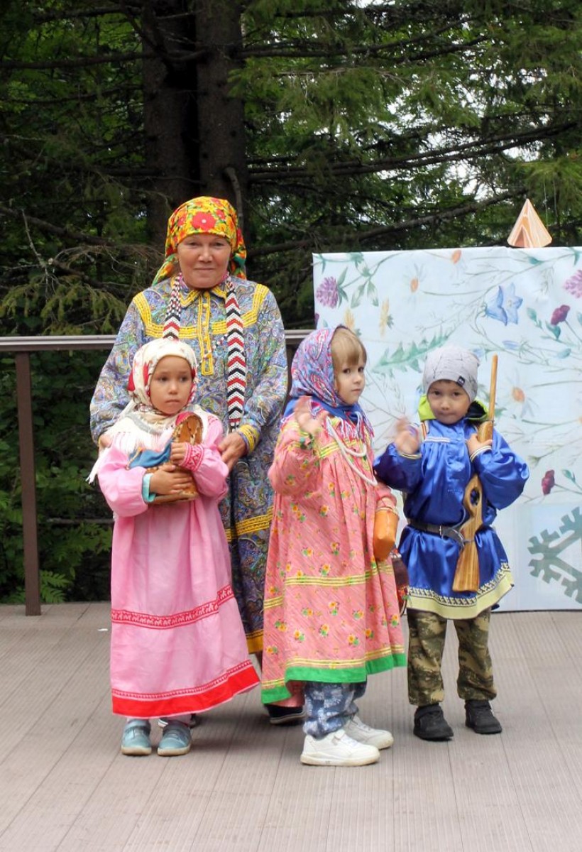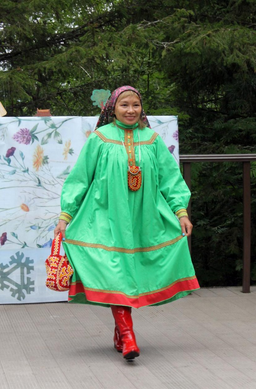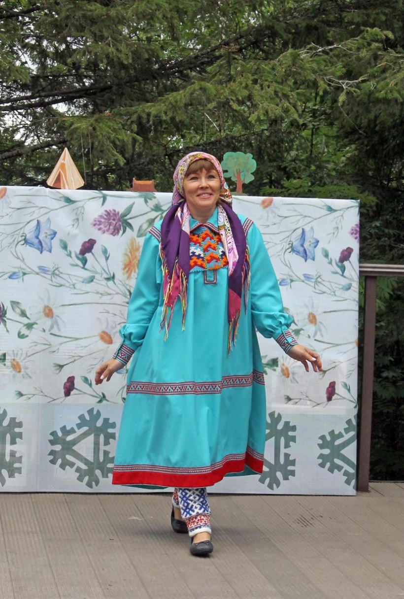 После торжественной части началось красочное шествие представителей малочисленных народов округа в национальных нарядах. Дамы все возрастов выходили на подиум как настоящие модели, демонстрируя не только орнаментированную одежду, но и головные уборы, обувь. Вместе с ними выходили и совсем юные участники этого необычного дефиле.