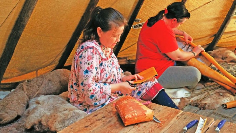 Кроме изготовления самих изделий, участники плели оленьи жилы и скоблили шкуры для ровдуги, необходимые для пошива берестяных изделий.