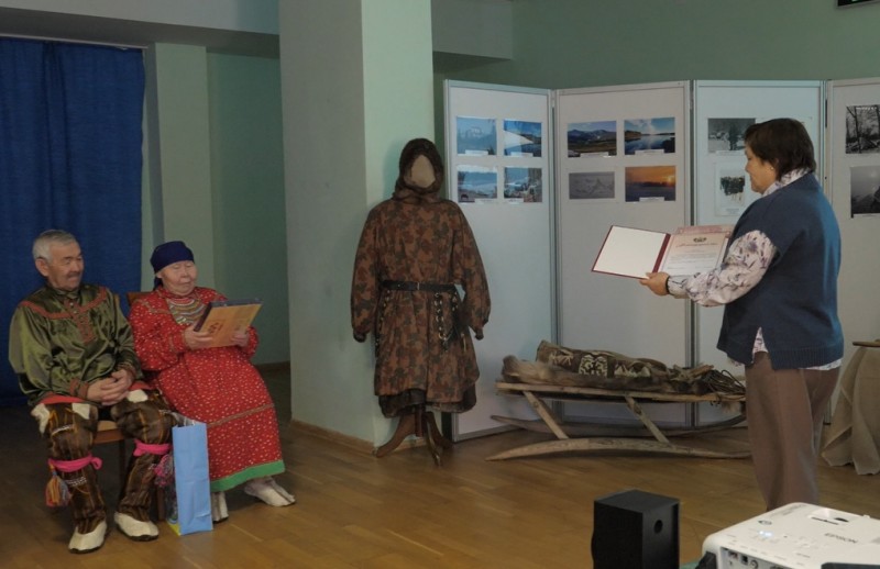 Музейная Гостиная была посвящена семье Вьюткиных. Именно сегодня, 19 февраля, Василию Николаевичу исполняется 75 лет, а его супруге Агафье Алексеевне ещё 6 января этого года исполнилось 70 лет. На первый взгляд, история жизни этих обычных людей простая: родились, работали, сейчас отдыхают на пенсии. Вся трудовая деятельность (тридцать пять лет!!!) Василия Николаевича и Агафьи Алексеевны связана с оленеводством.