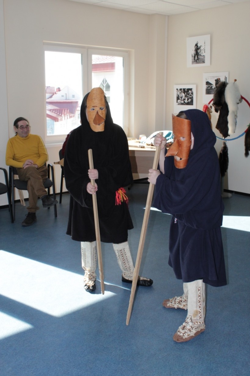 Сегодня занятия постоянно посещают пять ребят, все они представители коренных народов. Тимофей Алексеевич обучает их танцам, песням на хантыйском языке, они показывают шуточные сценки в традиционных костюмах.