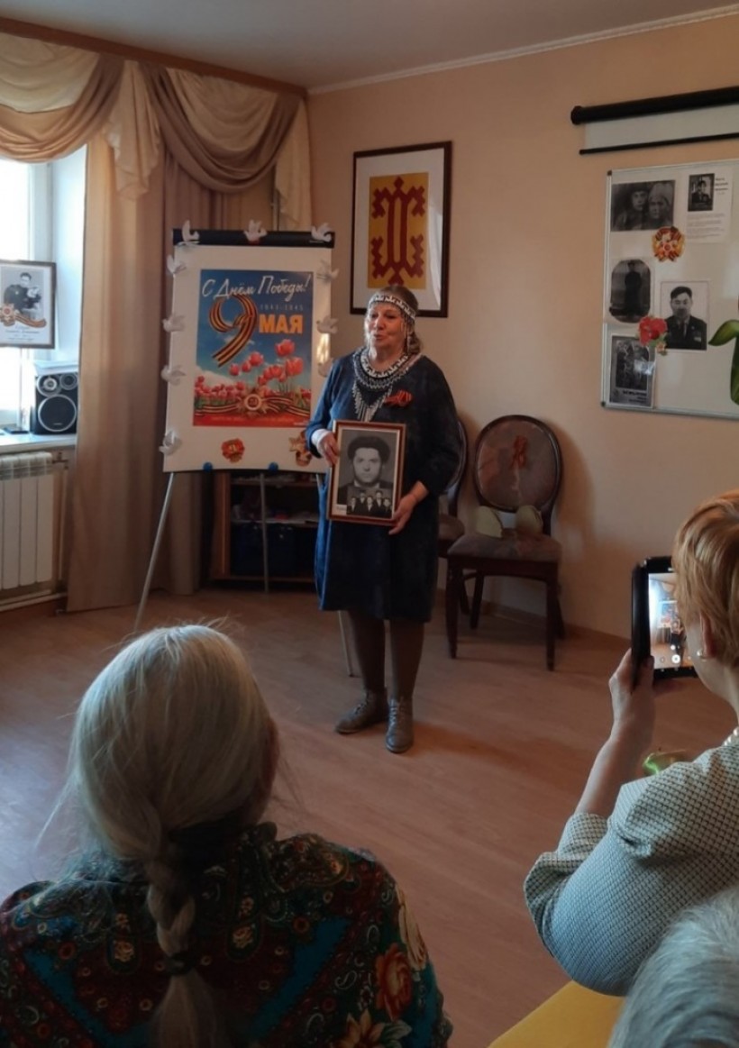 Затем за праздничным столом гости встречи рассказали о военных и трудовых подвигах своих родственников, пели песни военных лет.