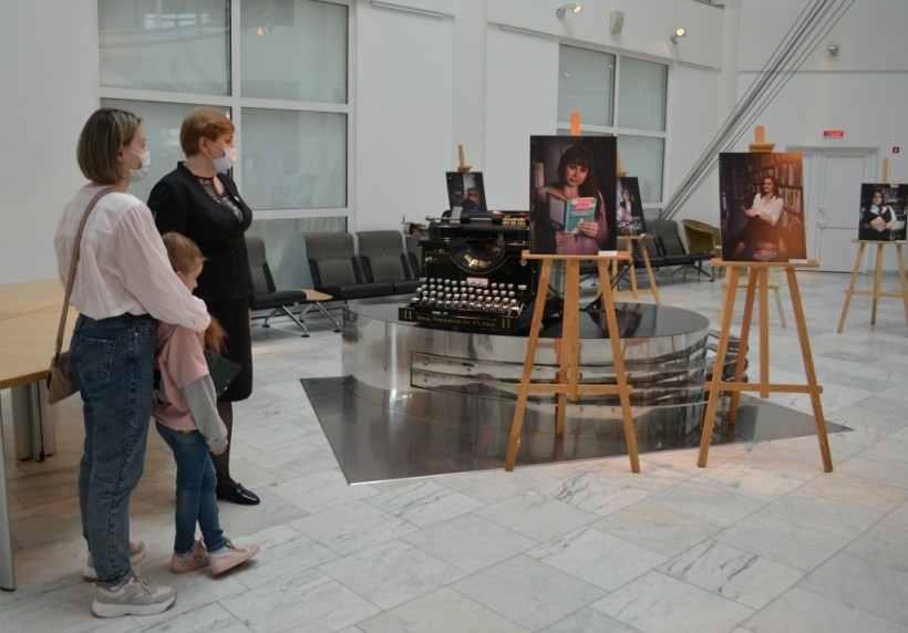 Нас встретила сотрудник библиотеки, специалист по связям с общественностью Евгения Ивановна Останина. Экскурсия началась с выставки лучших библиотекарей 2020 года, которые работали в сложный период пандемии. Также здесь в фойе была представлена фотозона, сделанная из книг и цветов.
