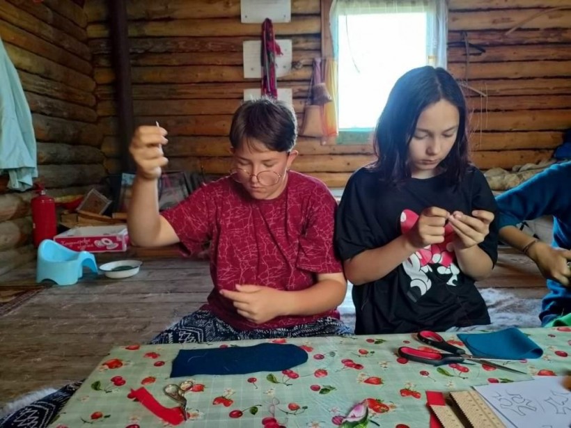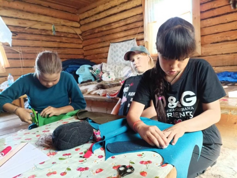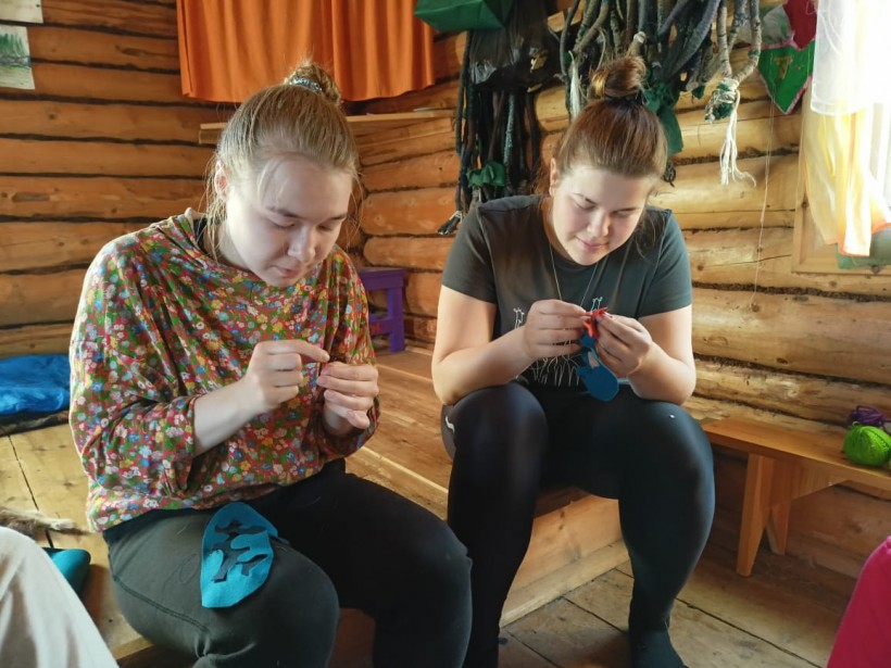 Девочки среднего возраста шили традиционные игольницы из сукна, вышивали тканью узоры. Это тоже сложная работа для ребенка, требующая усидчивости и сноровки. Старшие девочки скроили и сшили мансийские платки «ватанг тор» для следующей смены «Время поющих стрел». «Ватанг тор» переводится как платок, имеющий берега, на основной кусок ткани по краям пришиваются широкие полосы ткани другого цвета, а затем нашивается бахрома.