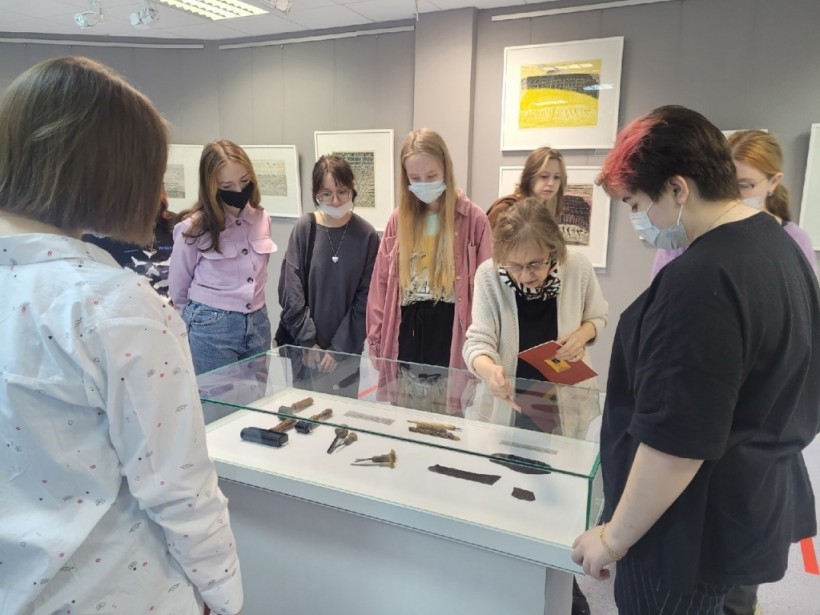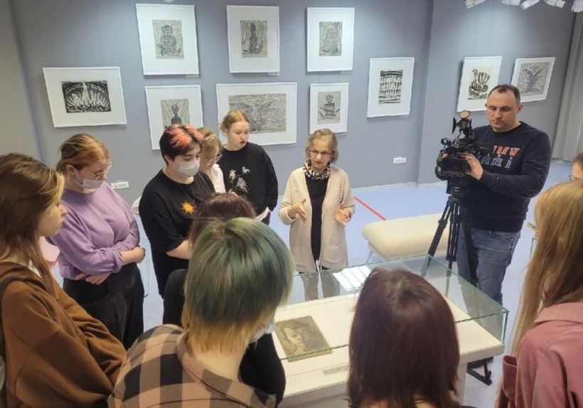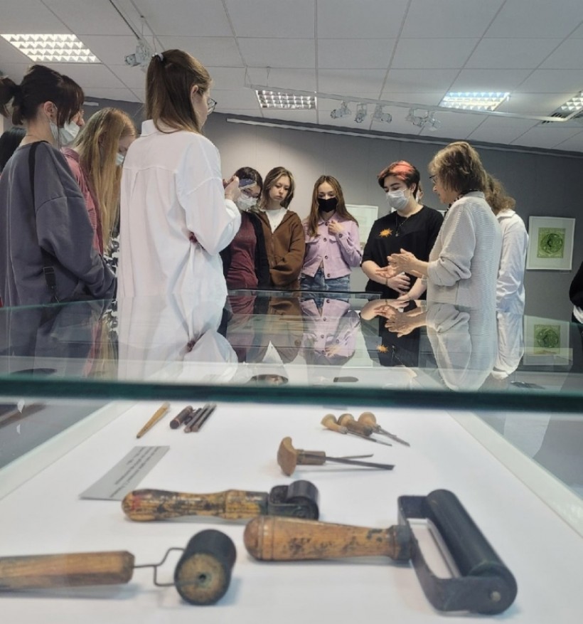 Вместе с темстуденты познакомились с разными техниками графики этого периода: линогравюрой черно-белой и цветной, офортом, монотипией, а также графическим инструментарием художника. В завершение знакомства с выставкой каждый получил в подарок издание авторского текста-исследования Г.С. Райшева «Отчего мучается художник», написанного для тех, кто ищет свой путь в искусстве.